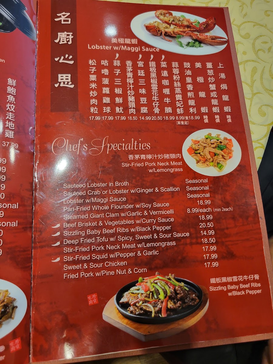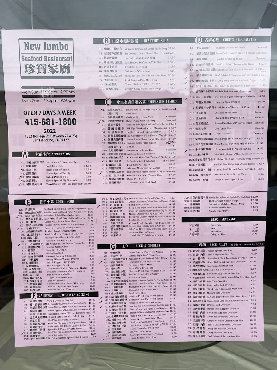 Looking for a place that offers the freshest seafood in San Francisco? Look no further than New Jumbo Seafood Restaurant Menu. Nestled on Noriega Street, this spot serves up a variety of flavorful dishes, all made with the finest, most sustainable seafood available. Whether you're craving sweet and succulent crab, tender shrimp, or perfectly cooked fish, there's something on the menu to satisfy every taste. From comforting soups and rich chowders to crispy fried options, each dish is prepared with care and served to make your dining experience unforgettable. Whether you're a seafood enthusiast or just looking to try something new, you'll find a satisfying selection to explore at New Jumbo Seafood.
